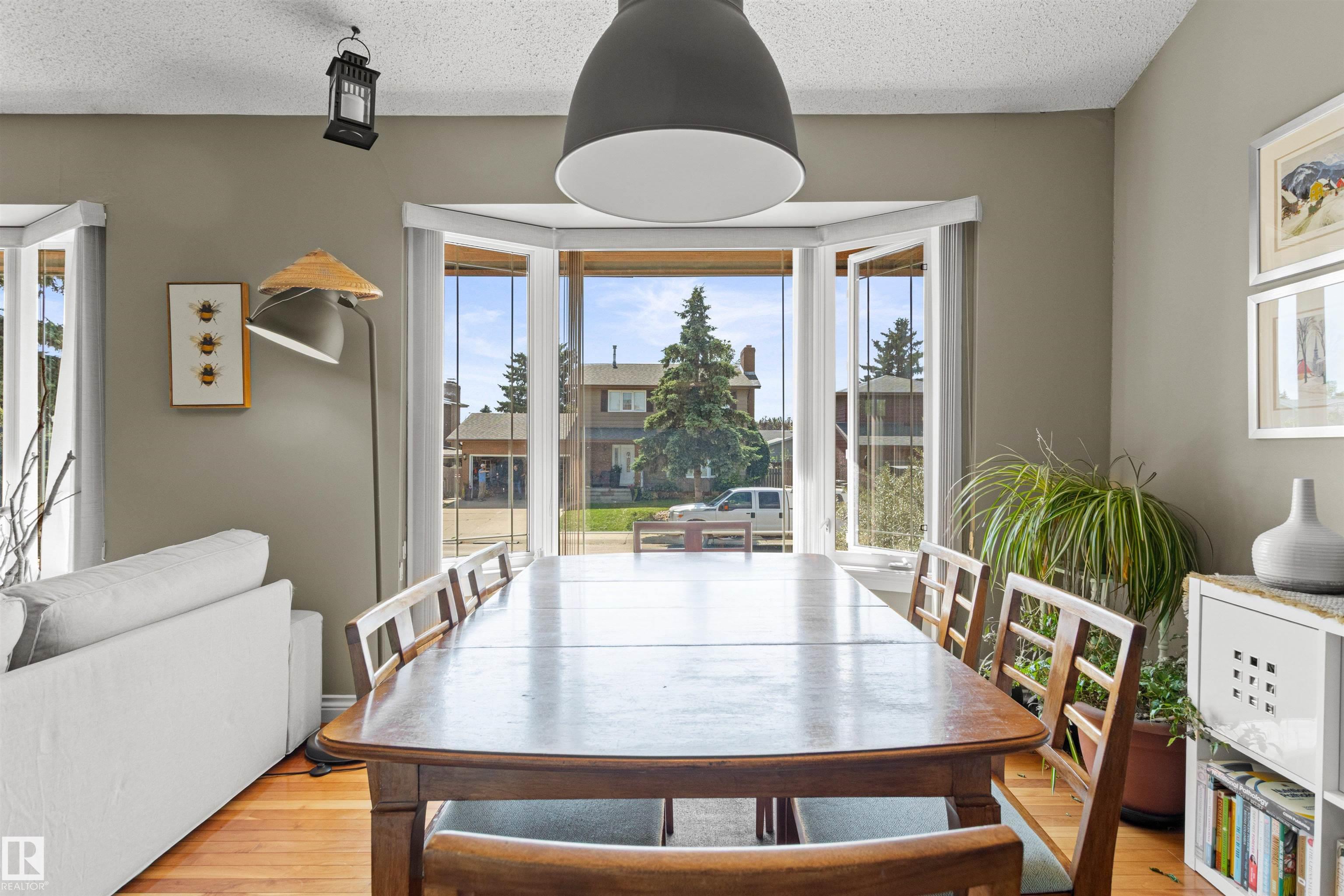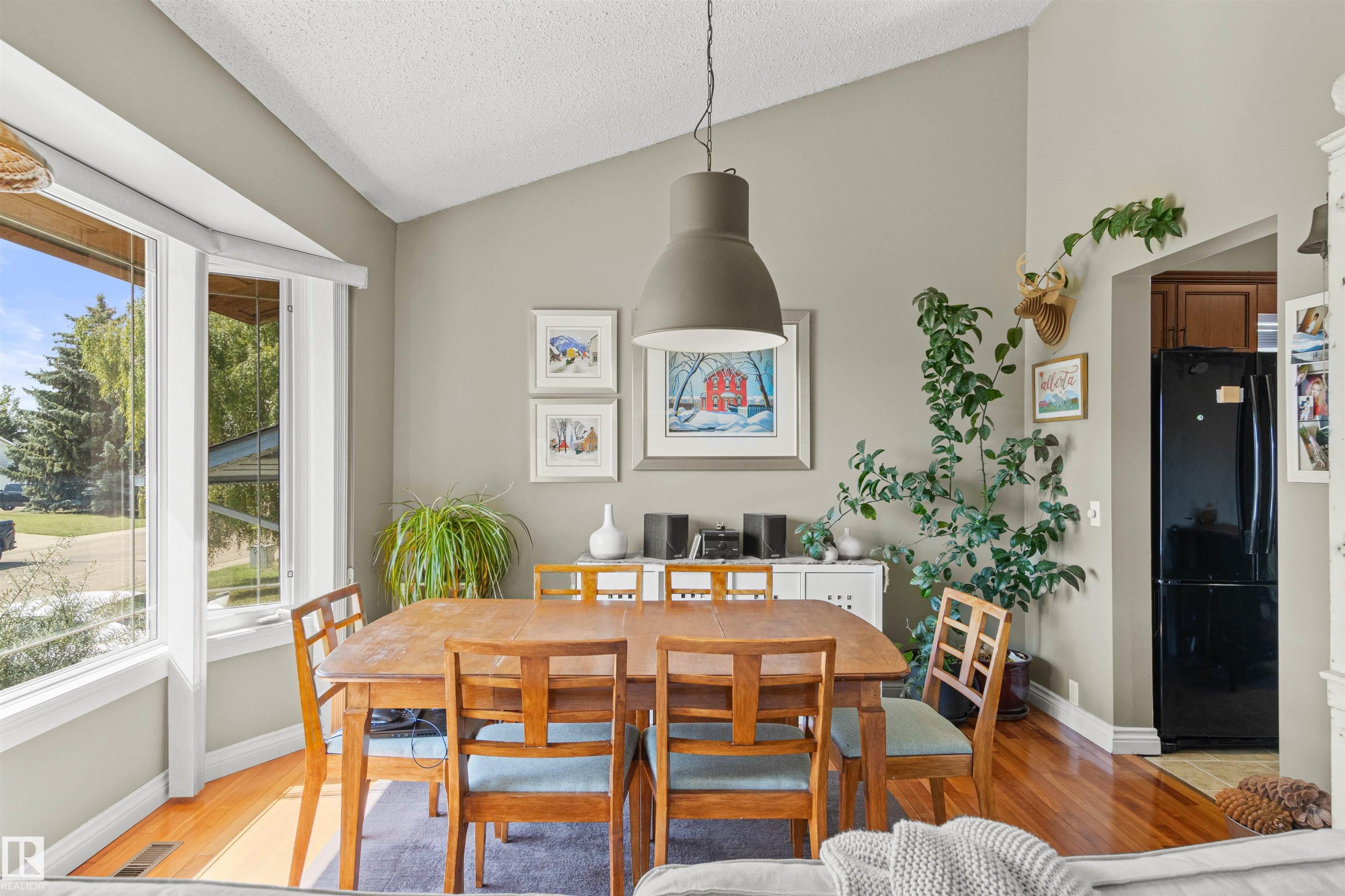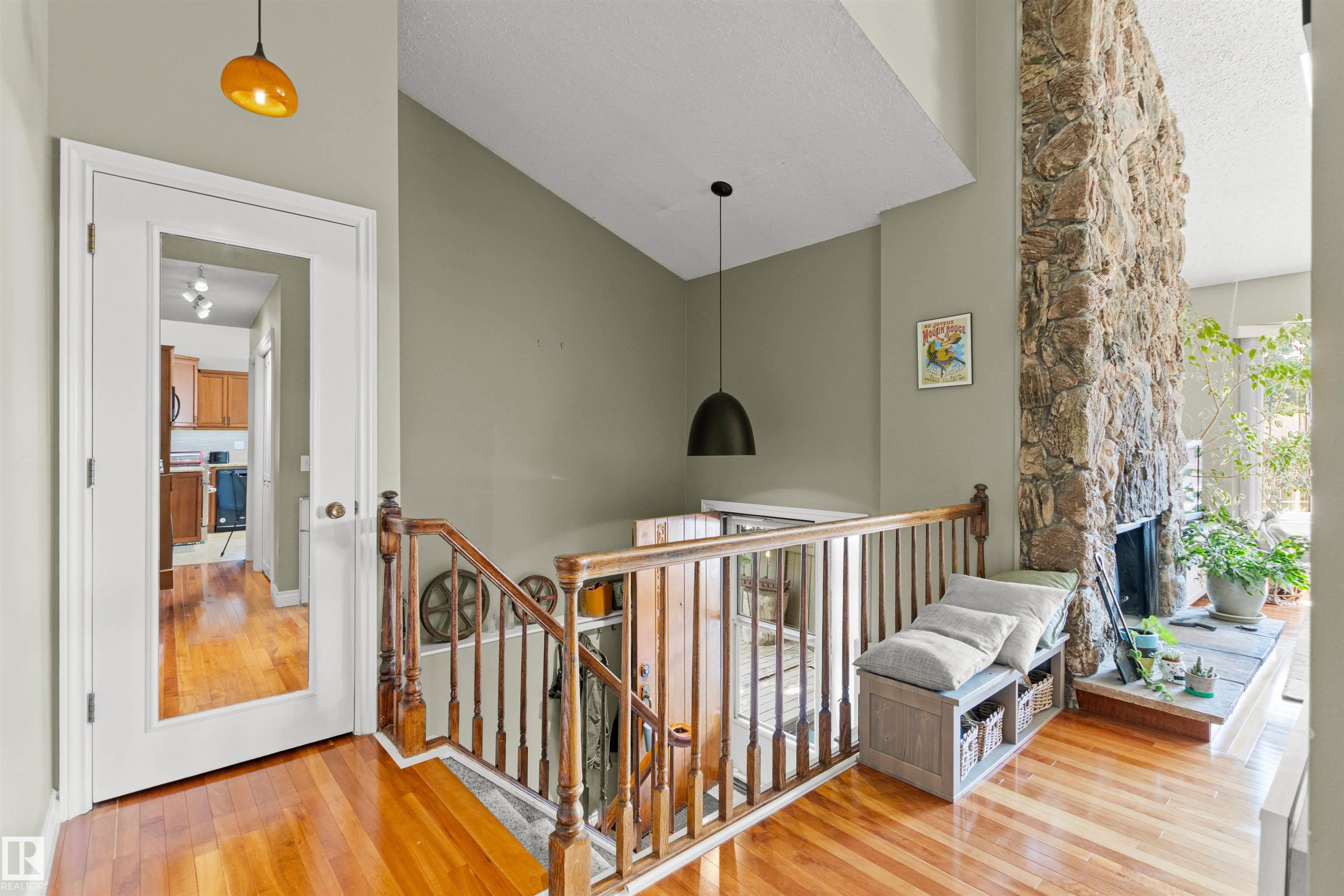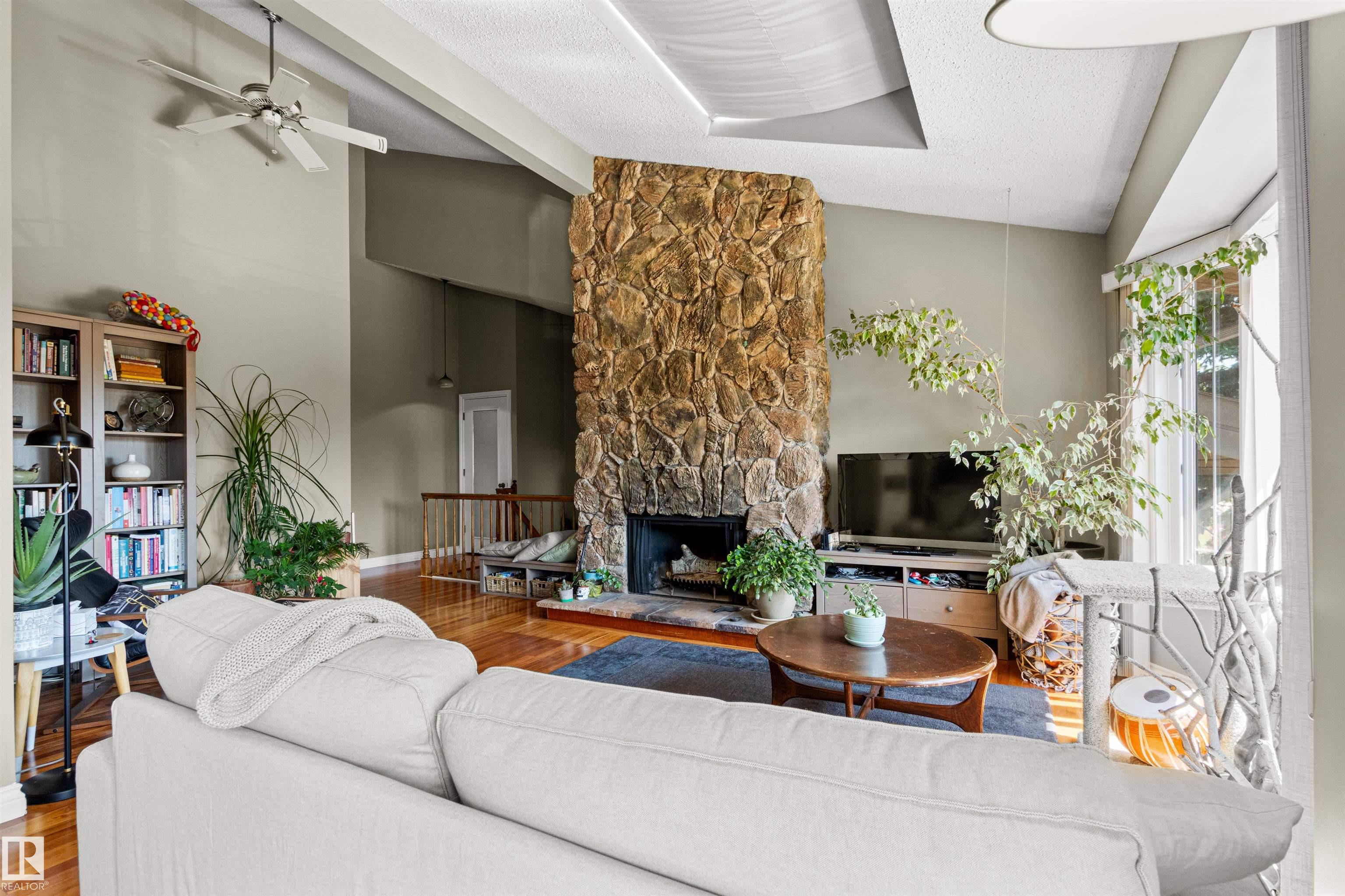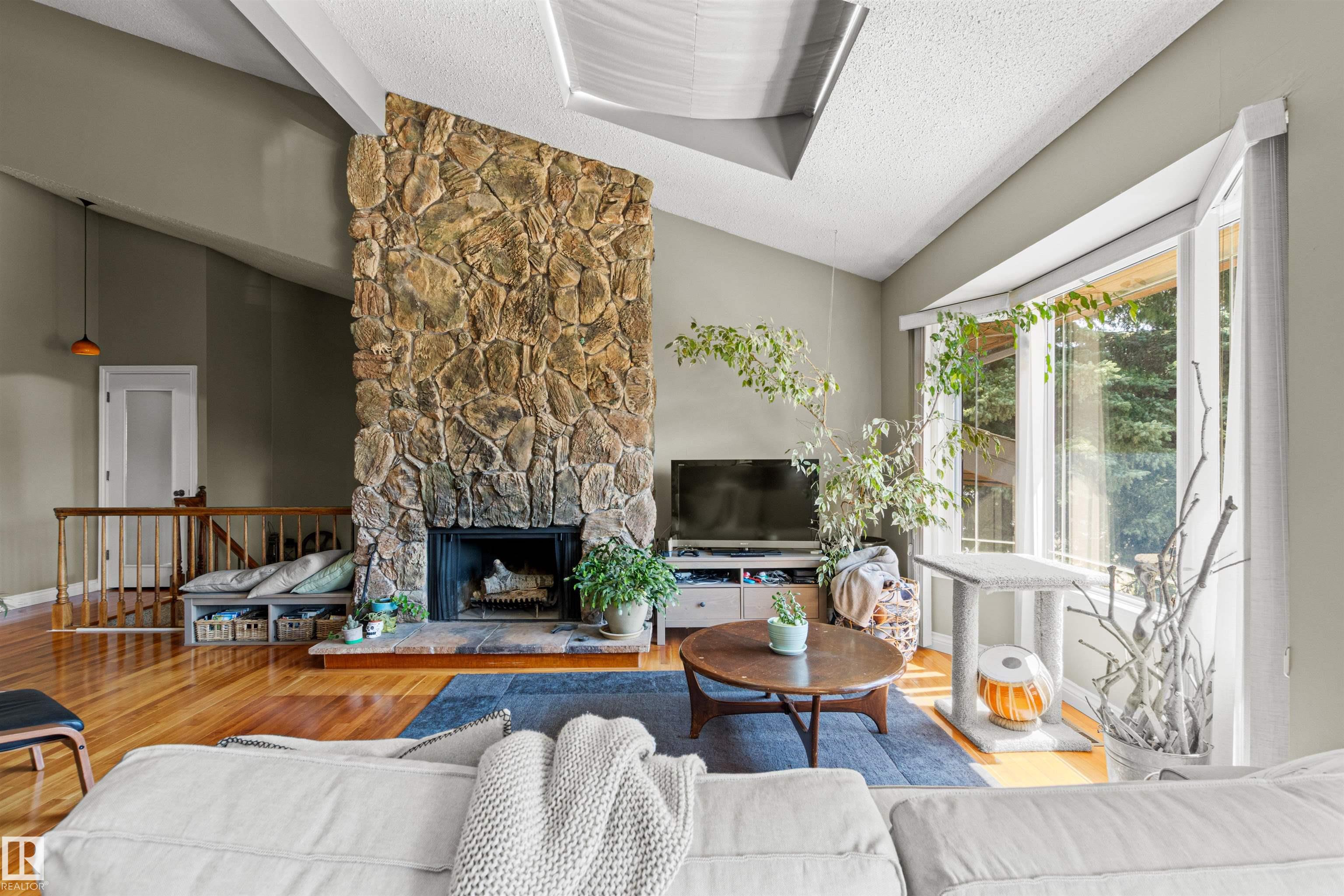 This upgraded bi-level blends timeless mid-century design with modern comfort. The dramatic vaulted ceilings and skylight flood the main floor with natural light, giving the living and dining areas an airy, inviting feel. Hardwood, tile, upgraded broadloom, and a stone-faced fireplace add warmth and character throughout. The kitchen is a standout with granite counters, soft-close stained cabinetry, and upgraded appliances. Triple-pane windows and neutral paint complement the wide trim and baseboards. Upstai...